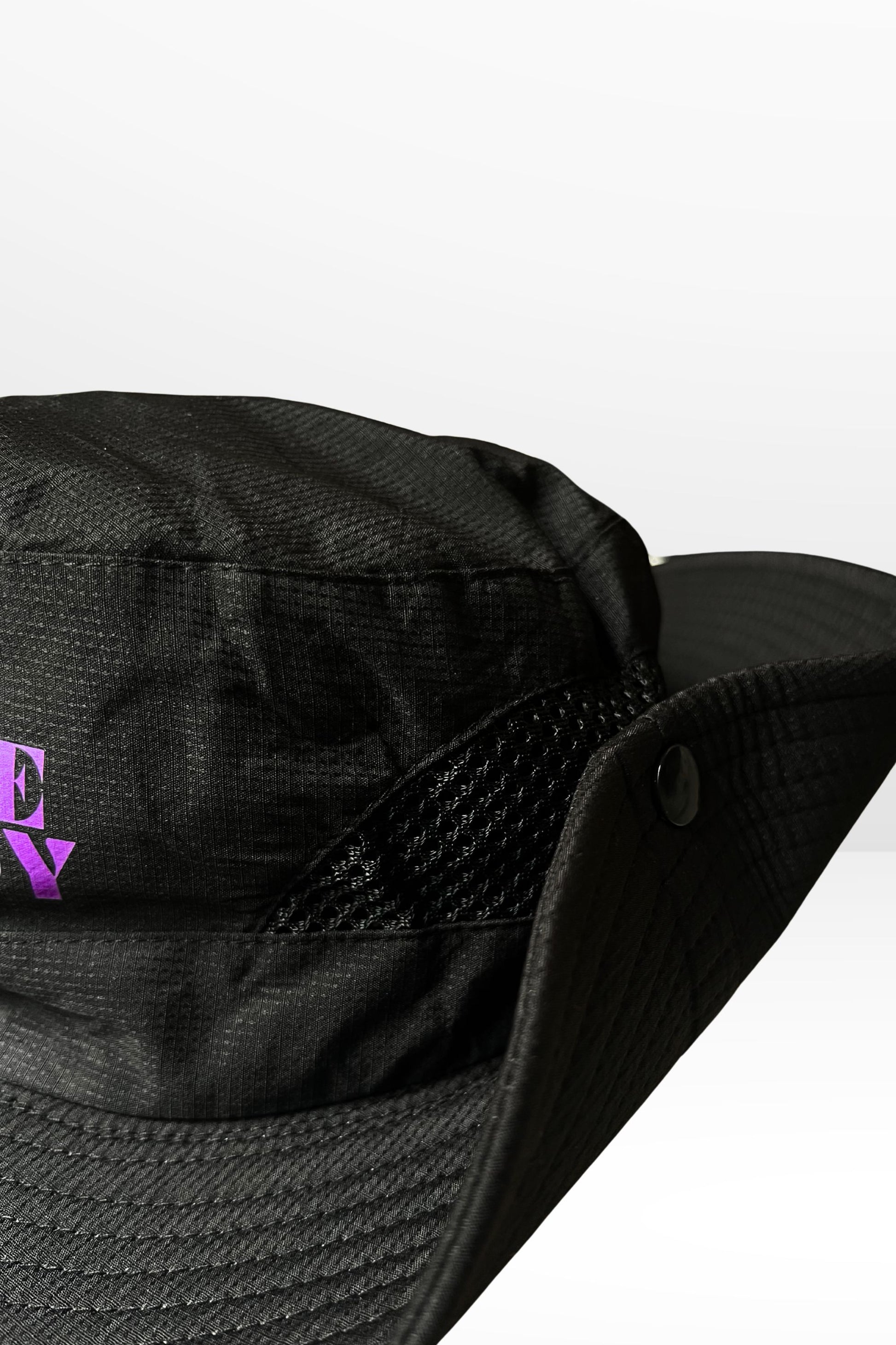 Chapeau noir munie d'une bride ajustable à l'arrière pour s'adapter à toutes les têtes et d'un cordon ajustable également !